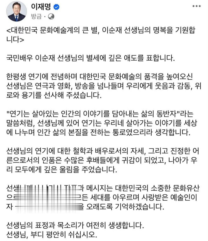 随后,韩国总统李在明在社交账号上发文悼念他,文字中给予他超高的肯定和评价。