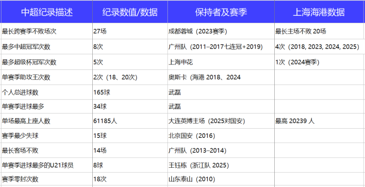 海港已打破中超历史上所有纪录?从客观数据看,穆斯卡特这话多少有王婆卖瓜的成分。因为还有很多中超的纪录至今上港也无法打破,比如广州恒大的七连冠等等。下图列举出了一些“能想到的”中超纪录。